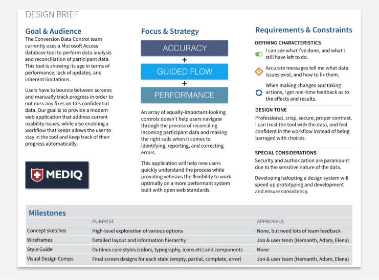 About the same time, being that I was wearing multiple hats, I started thinking about the priorities for the design of the new tool from a user experience perspective, so I created a design brief to help communicate those ideals.
